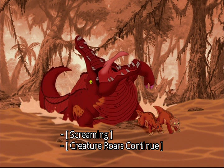 - The scene turns red when the Belly Dragger reveals itself to attack Littlefoot's friends; it turns back to normal when the Belly Dragger gets stuck under the tree. This was to make the scene more climatic between the main characters encounter with the Belly Dragger and may been to express the sheer anger of the creature.