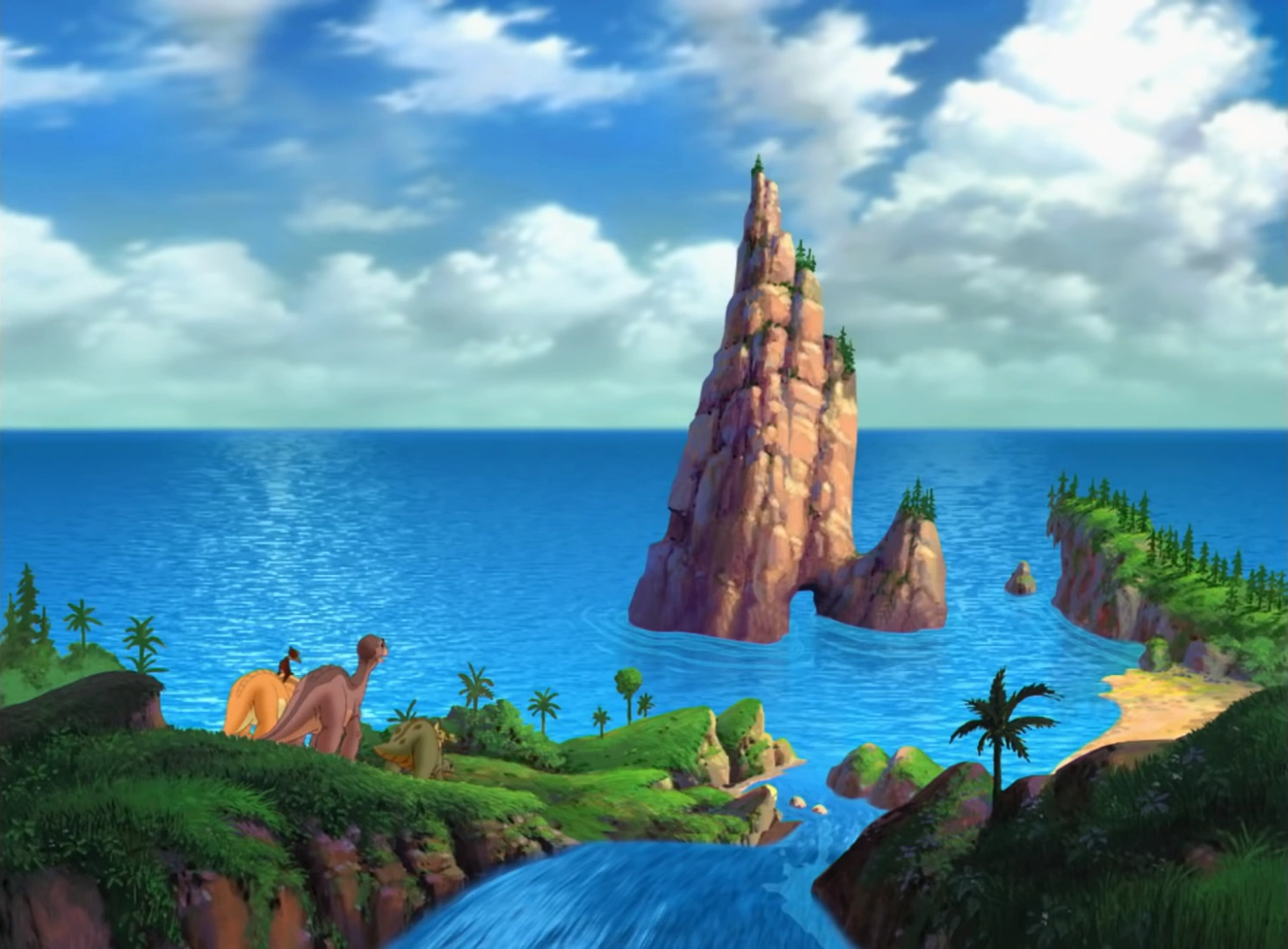 The island where the gang encountered Chomper in The Land Before Time V: The Mysterious Island is surrounded by the Big Water. It is also near some fresh water and green food, as of looking for Littlefoot and his friends that the Great Valley adults had found a spot with plenty of fresh water and green food for the herd to stay until the Great Valley regrew and they were able to return.