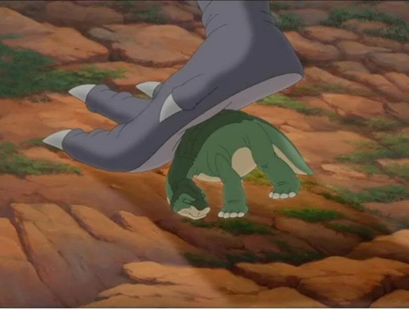 Shorty is the young bully in The Great Longneck Migration, since he had a nasty past, and although Bron continued to check up on him frequently, he was the only one from that small herd that was not adopted until the end of the film, implying that he was both lonely and had an inferiority complex. He was antisocial, mostly wandering by himself and picking on other young dinosaurs, including Littlefoot. But as Bron says, Shorty is really a good kid at heart and just likes to get things started. After Littlefoot presents the idea of brotherhood to Shorty, he reveals a more friendly side of his nature. He seems to be intrigued by Cera's headbutting strength and skills.