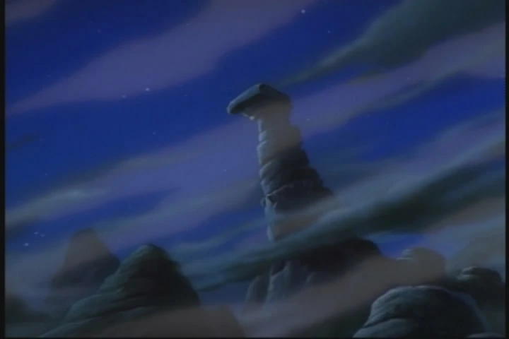 Night-view of Saurus Rock, a monolith vaguely resembling the Lone Dinosaur, and said to bear the teeth of the sharptooth he defeated.